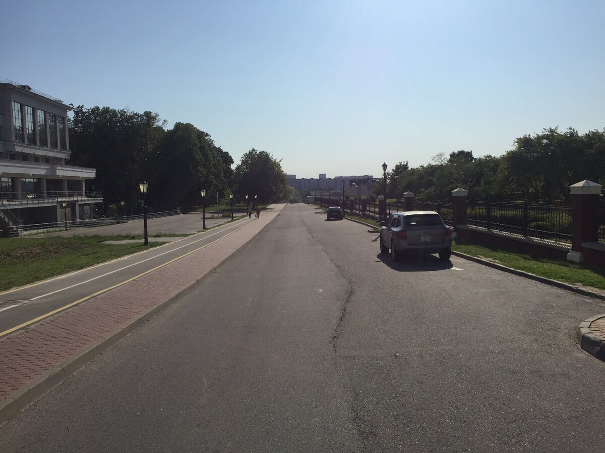 1. Бородинская улица, проходящая вдоль северной границы парка, спускается в долину Свислочи, вдали виднеется спальный район Серебрянка. Район Лошица застраивался в 2000-е годы и находится южнее усадьбы рядом с МКАД (это минская кольцевая).