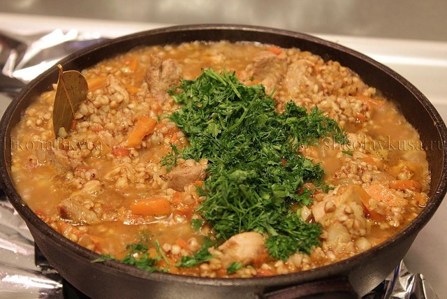 Затем долить не много воды,добавить лавровый лист, и потушить мясо под крышкой на маленьком огне до готовности. Гречку перебрать,залить кипятком минут на 5,затем воду слить. Отдельно обжарить мелко порезанную луковицу и морковь натертую на терке,добавить овощи к мясу и измельченный чеснок, посолить,поперчить,добавить гречку, долить горячей воды чтобы гречка была покрыта с палец высотой,довести до кипения, затем накрыть крышкой и томить на маленьком огне пока вся жидкость не впитается а гречка не станет мягкой.Затем огонь выключить,можно добавить кусочек сливочного масла и перемешать.
