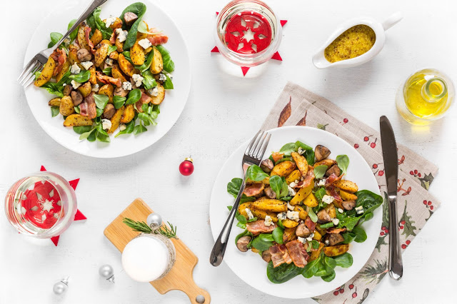 Шпинат и корн помыть и обсушить. Уложить их на большое блюдо (либо порционно по тарелкам), сверху равномерно распределить картофель, грибы, бекон. Полить половиной заправки и посыпать раскрошенным сыром.