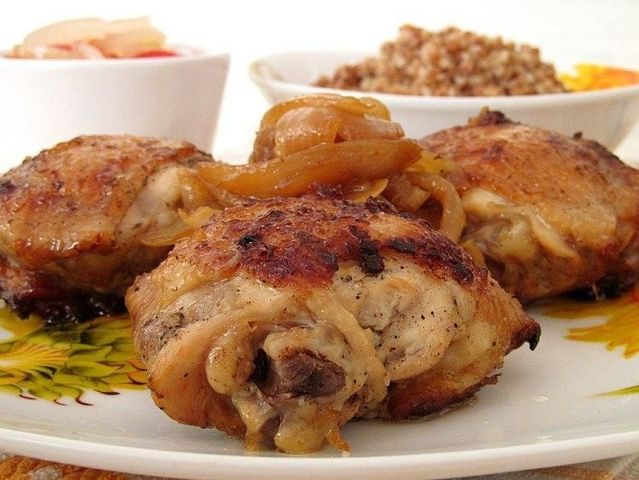 Бедра выложить в миску шкурной вниз, пересыпая каждый кусочек маринованным луком.