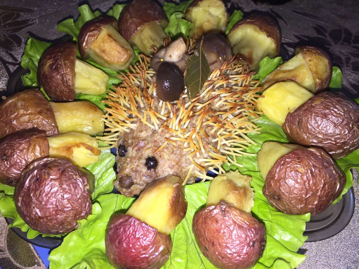 Блюдо хоть на воскресный обед, хоть на праздничный! Режем ежа просто дольками, как рулет. Некоторые любители могут похрустеть иголками-вермишелью. Но я одним движением ножа легко скидываю все иголки. Если он постоит в плошке с крышкой, то и на следующий день холодный вкусный. Да еще и иголки станут мягкими.