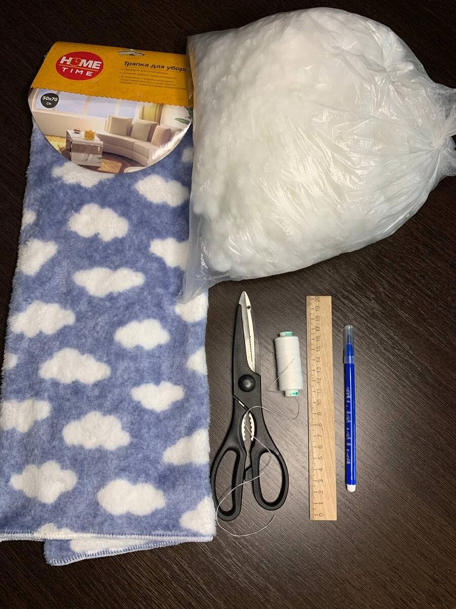 Для пошива я использовала: ножницы, иголка с ниткой (нитка должна подходить под цвет вашей ткани), линейка, фломастер, английские булавки, наполнитель для игрушек/подушек (у меня холофайбер - покупала в ателье 35 рублей за 100гр, также можно использовать синтепон. Не рекомендуют использовать медицинскую вату, так как она влаговпитывающий материал, ваша подушка собьется и сваляется внутри, потеряет форму, а восстановить ее невозможно), и наша тряпка для уборки ( покупала в FixPrice).