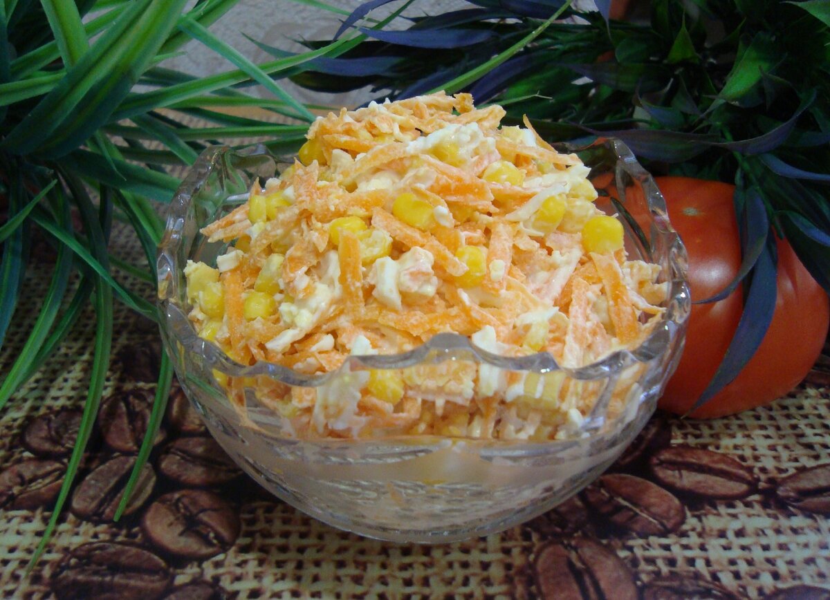 Сегодня хочу поделиться с Вами рецептом салата "Из моркови, яйца и кукурузы" для повседневного стола. Знакомая соседка по лестничной площадке поделилась рецептом салата и сказала, что она покупает морковь в магните намного чаще, чем раньше и готовит из нее салаты, так как у неё пенсия маленькая и не всегда есть фрукты на повседневном столе. А морковь очень полезна, она может достать её в любое время и приготовить салат "Из моркови, яйца и кукурузы". Салат получается очень вкусный, сочный, лёгкий, яркий и смотрится на столе очень аппетитно. Такой салат готовлю теперь постоянно и он никогда не приедается.