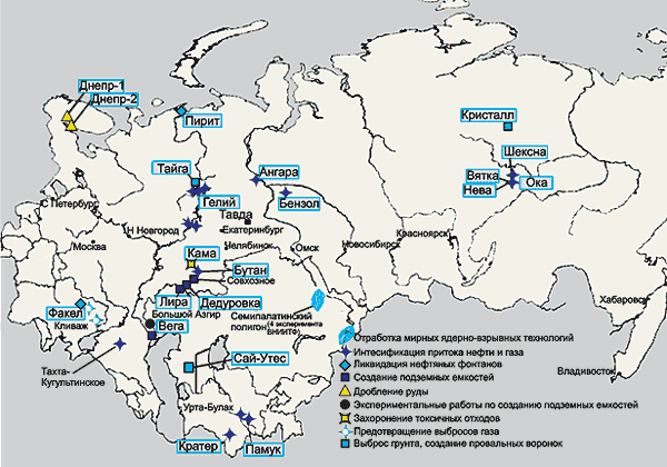 В 1965 году осуществили термоядерные взрывы на территории Башкирской АССР, примерно в 10 километрах от города Мелеуз. Благодаря этому удалось вдвое увеличить объемы добычи нефти. А так как этот способ оказался выгодным, повторяли процедуру ещё несколько раз: в Якутии, Калмыкии, Иркутской и Кемеровской областях, Красноярском крае и других регионах.