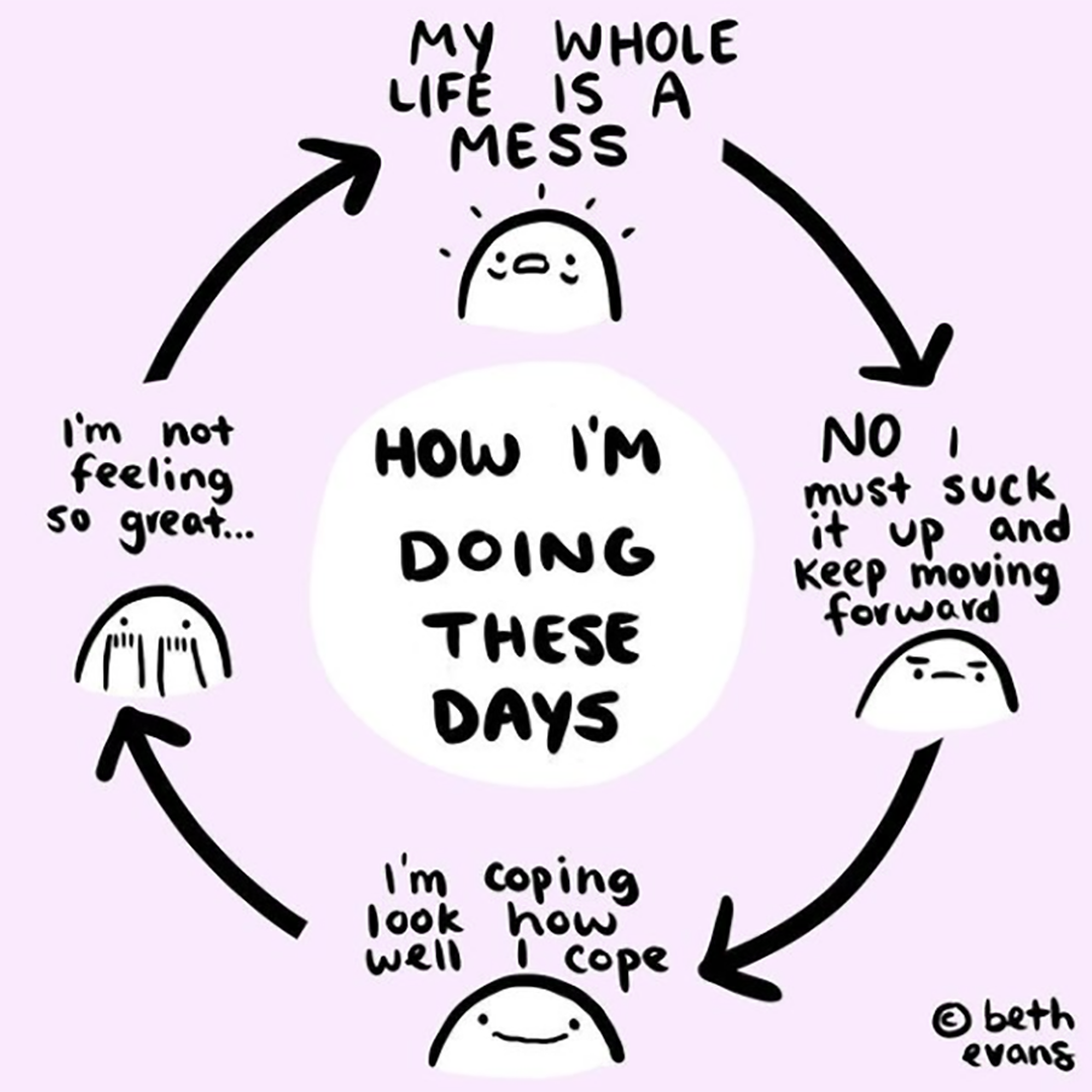 Hello! Для нашей очередной статьи мы отыскали реалистичный комикс от художницы Бет Эванс, повествующий о круговороте мыслей, в котором мы постоянно вращаемся. Специально для вас мы решили подробно разобрать в сегодняшних карточках 3 полезных слова и выражения из этого комикса, которые вам просто необходимо запомнить: mess, to suck it up и to cope