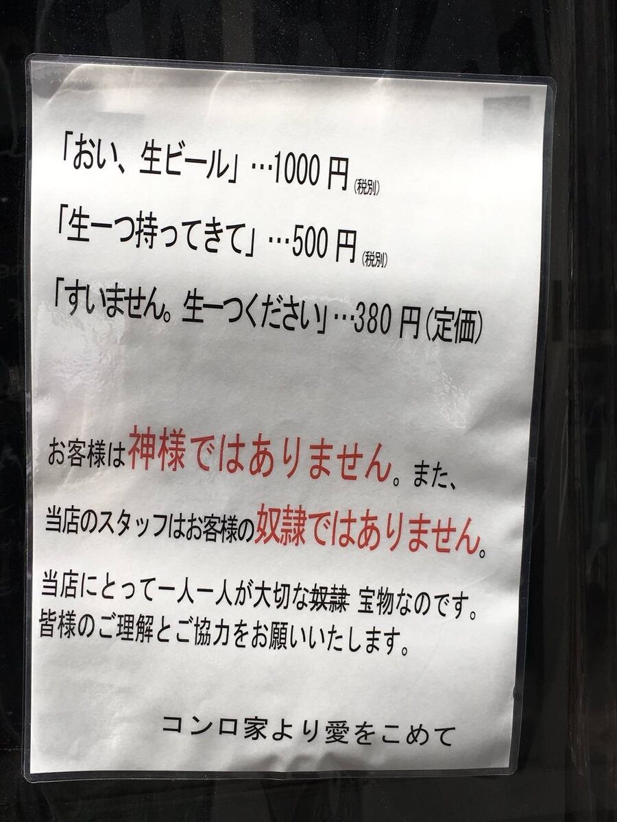 «Эй, пива» — 1000 иен «Принеси мне одно пиво» — 500 иен «Извините. Принесите, пожалуйста, одно пиво» — 380 иен