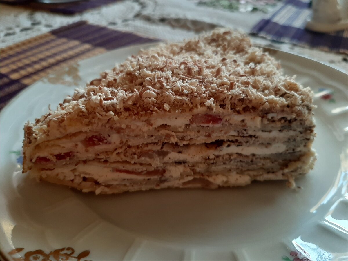 На тарелку выложить блин, смазать подготовленным кремом. Если блины действительно получились тонкими и нежными (!👍), то далее прослаивать торт, укладывая сразу по 2 блина: 2 блина, крем, 2 блина, крем и т.д. Верхним слоем 1 блин. Торт украсить тертым шоколадом. Убрать в холодильник на ночь (при желании можно есть сразу😋).