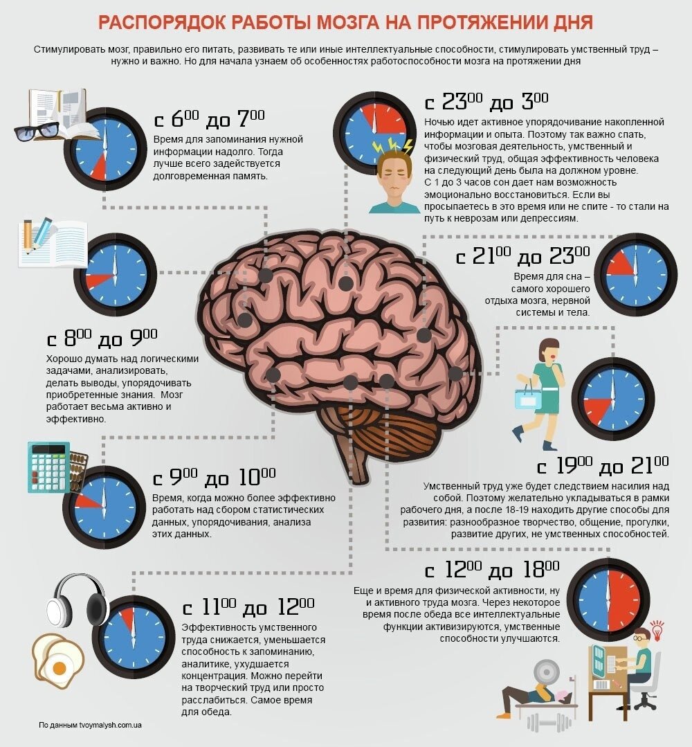 Мозг — часть организма, имеющая свои биологические ритмы активности и пассивности. Учитывайте их, работая над тренировкой интеллекта.