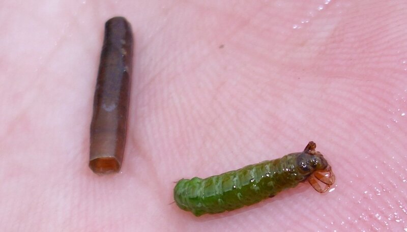 Личинка похожа на ручейника, но во много раз меньше и водится на течении на траве ,закрепляет свои маленькие домики на длинной траве и держится так примерно до мая ,потом превращается в