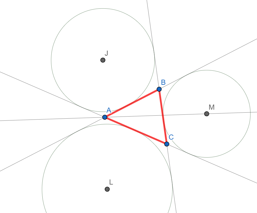 1) Центр вневписанной окружности - это точка пересечения биссектрисы двух внешних углов и биссектрисы внутреннего угла, не смежного с ними