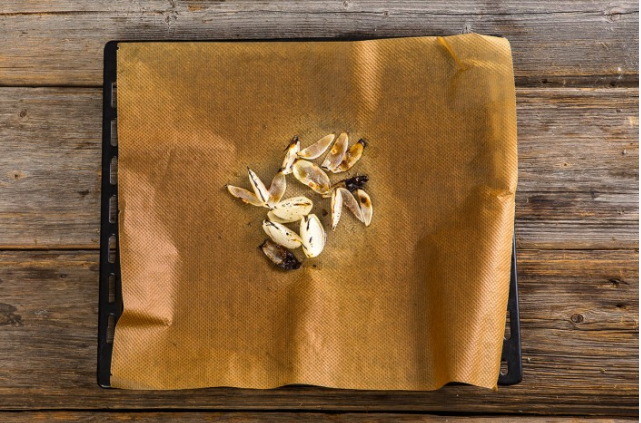 Лук очистите и разрежьте на 10 долек. Переложите лук на противень, посолите, сбрызните подсолнечным маслом и поставьте запекаться на верхний уровень в разогретую духовку на 7 минут.
