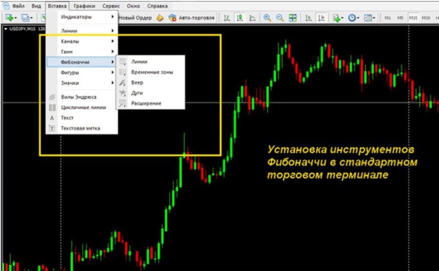 Так как одной из самых популярных платформ считается Мета Трейдер 4, то пример мы будем рассматривать именно на ней. Для того, чтобы нанести уровни Фибо на график, необходимо перейти в графу "Вставка", выбрать вкладку "Фибоначии" и уже в ней кликнуть по строчке "Линии".