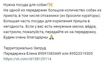 Друзья, к нам поступило срочное сообщение о том что на одной из передержек, превратившаяся в приют, очень нужна посуда для собак. Территориально это г.Пермь, мкр.Запруд. Там, в Запруде, содержится 3 десятка собак, многие из которых содержатся бесплатно, те что брошены кураторами или живут на доживании (старички, пожизненно больные и инвалиды). После зимы часто в негодность приходят не только собачьи миски, то что бывает они их грызут, а и тазы, ведра, особенно пластиковые которые портятся больше даже не от зубов, а от морозов. Честно говоря и у нас за зиму часть пластиковой посуды треснуло. Вроде и стараемся аккуратно использовать, но всяко бывает, ибо с собаками часты и спешки и что то бывает забыто, так как собаки частенько отвлекают внимание и случаются ситуации что бывает совсем не до посуды. Мы очень будем благодарны в помощи приобретения посуды, практически любой. Потому как на два приюта распределим по необходимости все что возможно будет подарено или привезено. Миски