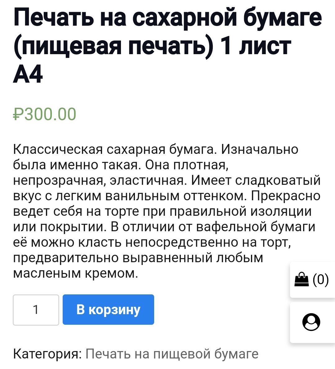 Печать на сахарной бумаге обошлась мне 300 рублей за один лист.