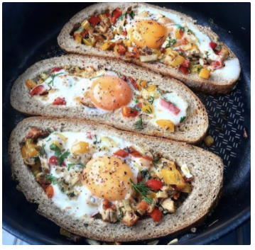 ✅Распределяем начинку на 2-3 части по сковороде, сверху выкладываем ломтики цельно зернового хлеба (предварительно вырезав середину, как на фото).