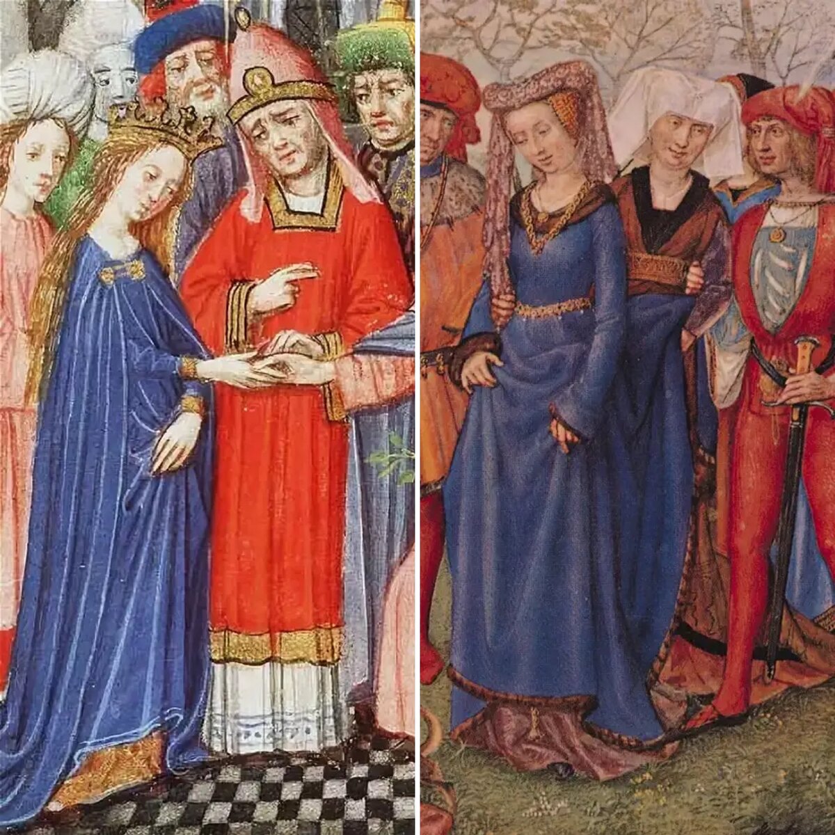 К примеру, на Изабелле Французской нижнее платье было голубым, а верхнее расшито и украшено так, что цвета не разобрать. Синим или голубым могла быть лишь часть наряда.