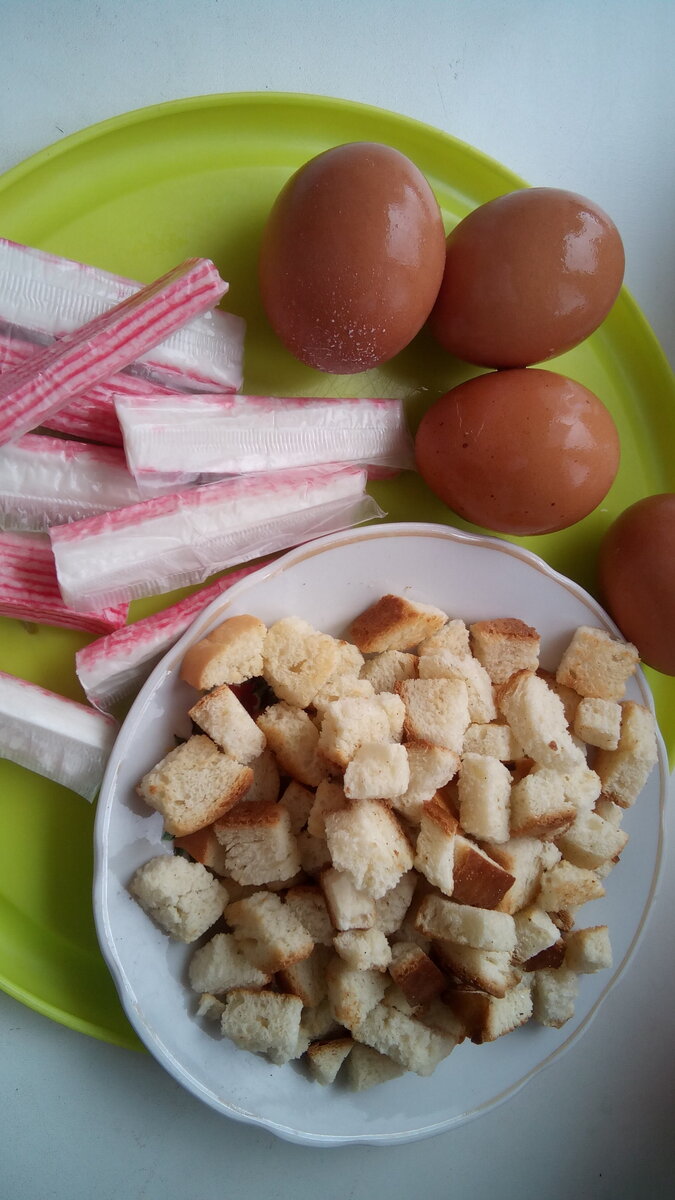 1 пачка крабовых палочек и 4 яйца вареные. Режим на кубики.