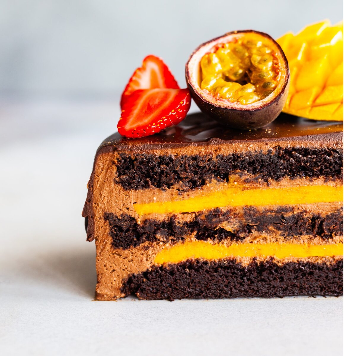 Первый корж выложить на блюдо, сверху равномерно распределить половину мангового пюре. Накрыть вторым коржом, выложить вторую половину пюре. Накрыть третьим коржом.