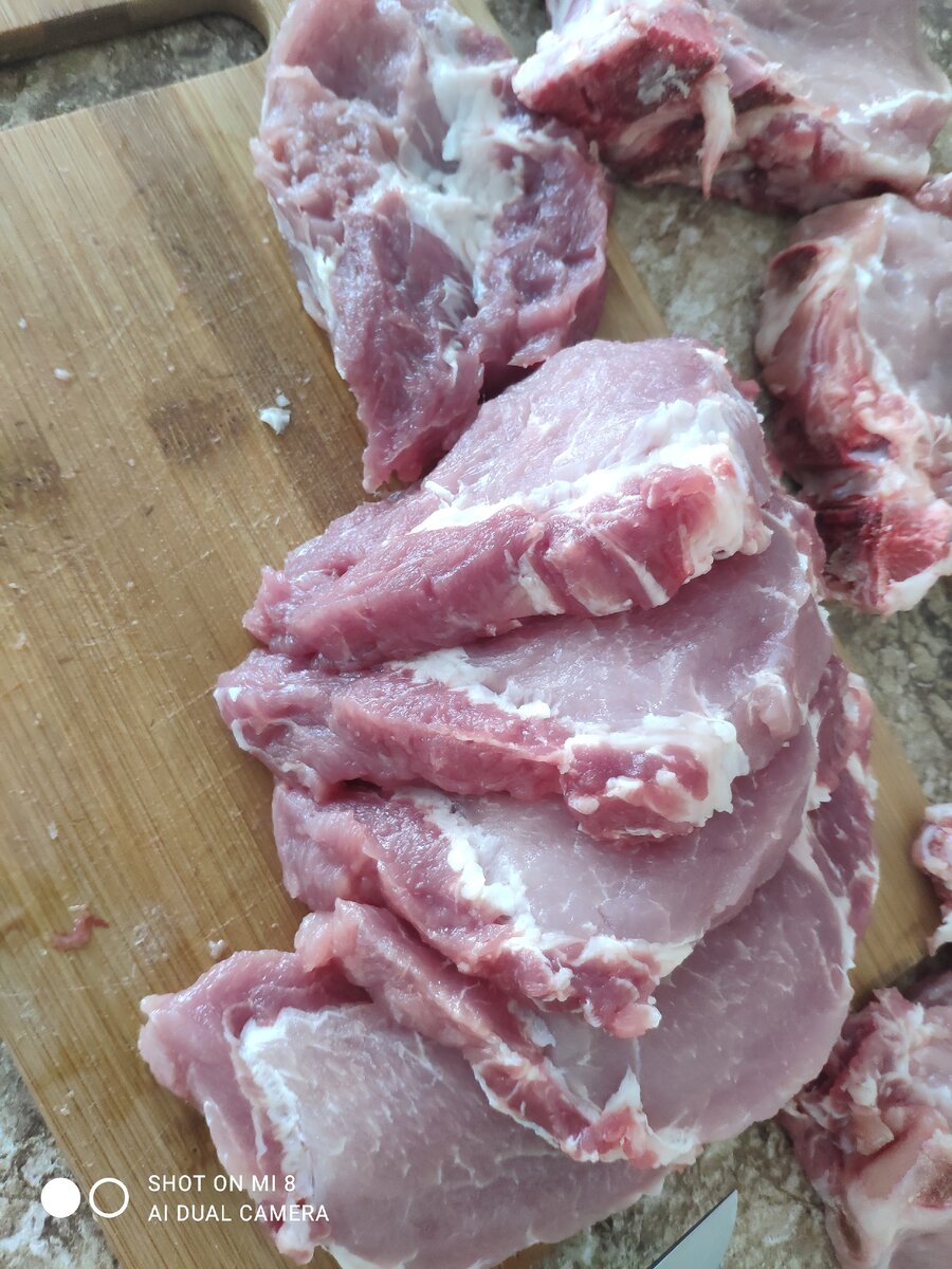 Из свиной шейки можно приготовить уйму вкусных блюд. Так как мясо нежное и сочное его лучше запекать. На мой сегодняшний обед я приготовлю два блюда из запечённой свинины. Перед вами два варианта мяса. Первый это шейка, нарезанная мной на кусочки поперек волокон толщиной в полтора сантиметра.