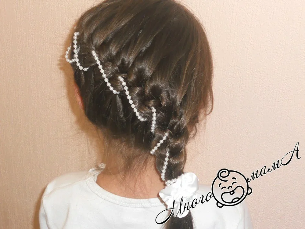 У основания косы закрепляю бусы с помощью невидимки или шпильки и прячу конец под волосами. Далее аккуратно продеваю бусы через плетение.