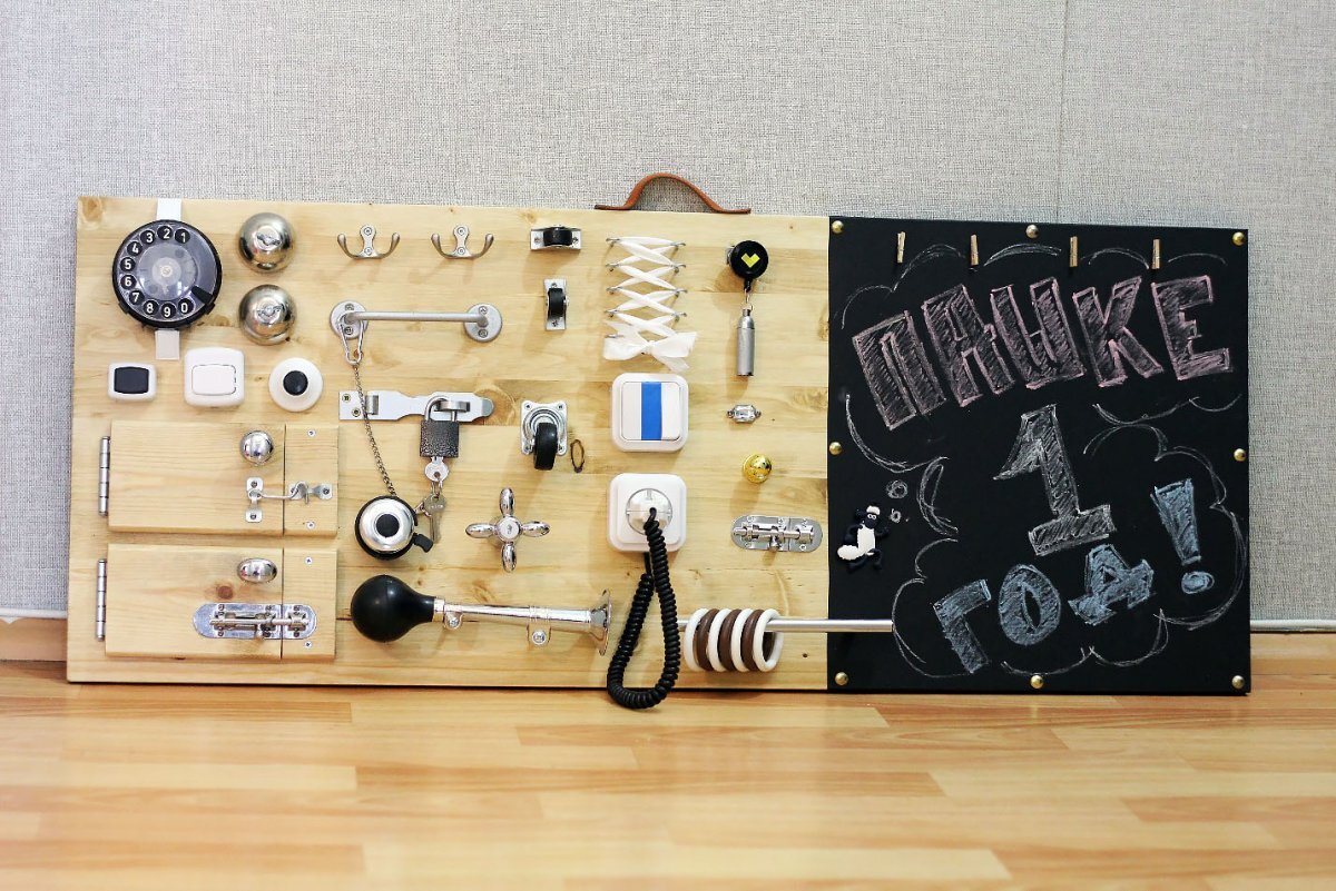 Сыну исполнился 1 годик . Я решил сделать для него подарок - бизиборд. Бизиборд – это игрушка для маленьких , чтобы развивать мелкую моторику . В роли игрушек я использовал : замки , шнурки, разные кнопочки , пульт , розетки , выключатели и т.п . Чем больше разнообразие всяких предметов , тем будет интереснее ребенку с ними играть и изучать их.