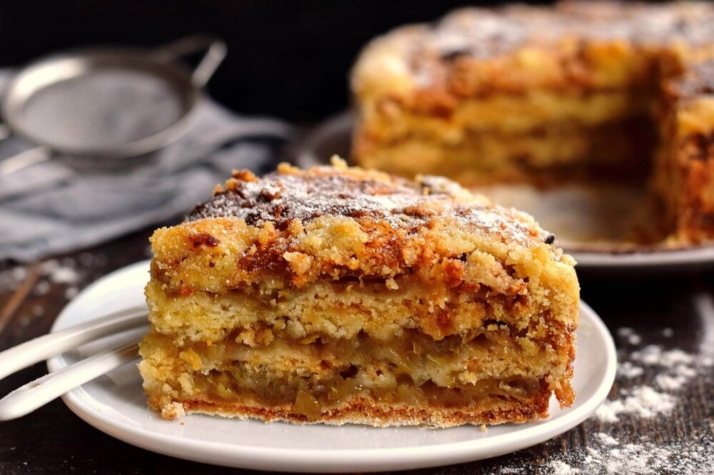 Таким образом сформируйте 4 слоя сыпучего теста и 3 слоя яблочной начинки.