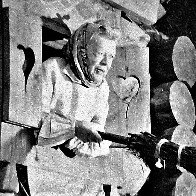 Ждут, как Михаил Иосифович будет показывать правильное держание метлы. На площадке тишина. Успеваю сделать фотографию Татьяны Ивановны. И тут её крик на весь лес: "Что ты ко мне сзади подкрался! Я тебя спереди ищу!". Это наконец-то Юзовский взобрался в избушку, желая показать Татьяне Ивановне как нужно выглянуть Бабе Яге из окна.