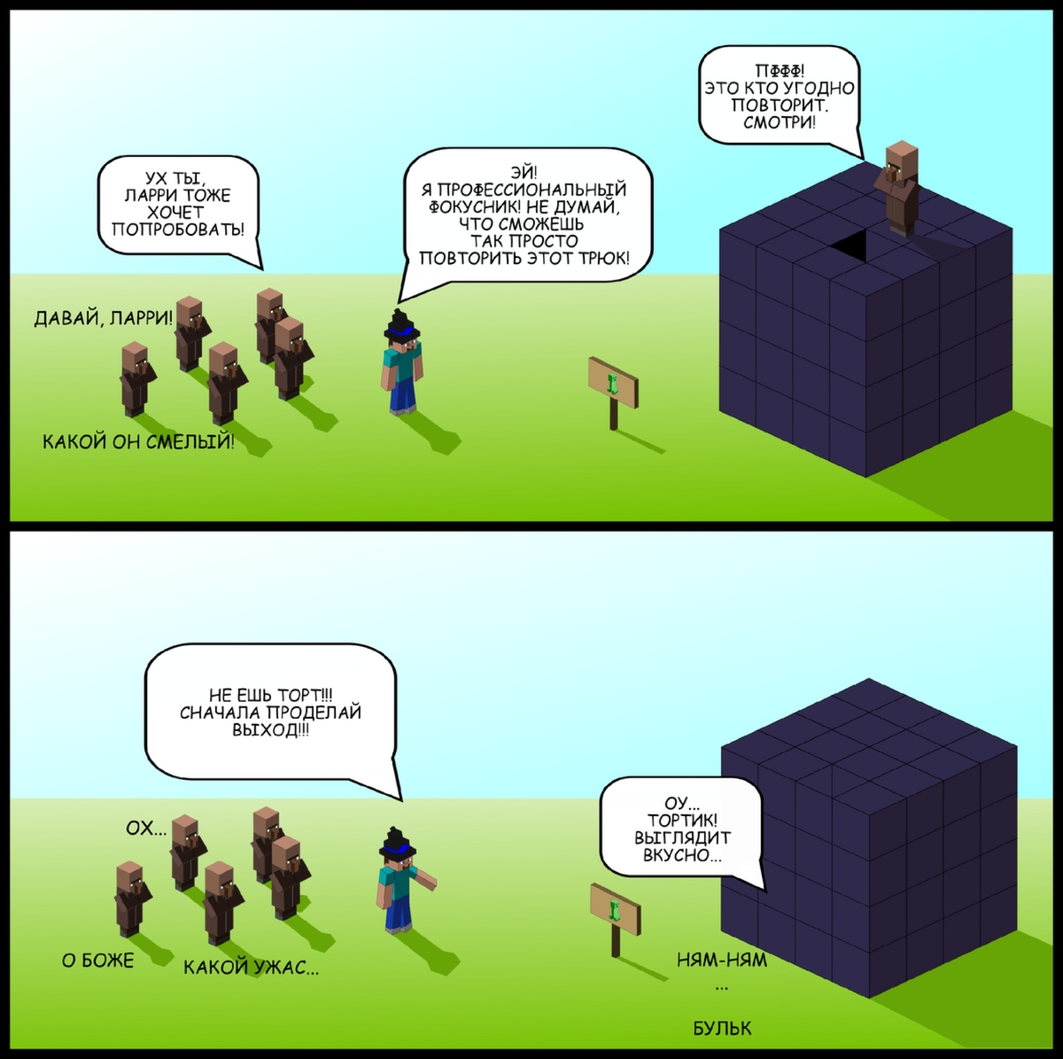 Новый выпуск! Судя по лайкам и просмотрам, вам так нравится этот формат, что я не буду никого томить в ожидании. А начнется все с небольшого волшебства. Магический трюк Знали ли вы, что торты, как и некоторые другие блоки, могут создавать воздушные пузыри под водой? Это знание использовал фокусник в следующем видео, чтобы выбраться из обсидиановой тюрьмы: Неожиданно, один из селян решил повторить трюк вслед за фокусником... Вы уже догадываетесь, чем это закончилось. Ведьмино зелье Пробовали когда-нибудь испытать на себе все эффекты одновременно? (За это даже дают достижение) Этот Стив пробовал, и ему показалось мало. Теперь он ищет новых необычных ощущений и скоро их найдет. И вот, что из этого вышло: Внутри больше, чем снаружи! Небольшой кроссовер с Доктором Кто. Стива долго интересовало, что скрывает необычный незнакомец в своем доме. Он ожидал увидеть что угодно, но только не нарушение законов реального мира. Вот что увидел внутри Стив: Такой эффект достигается с использованием мода