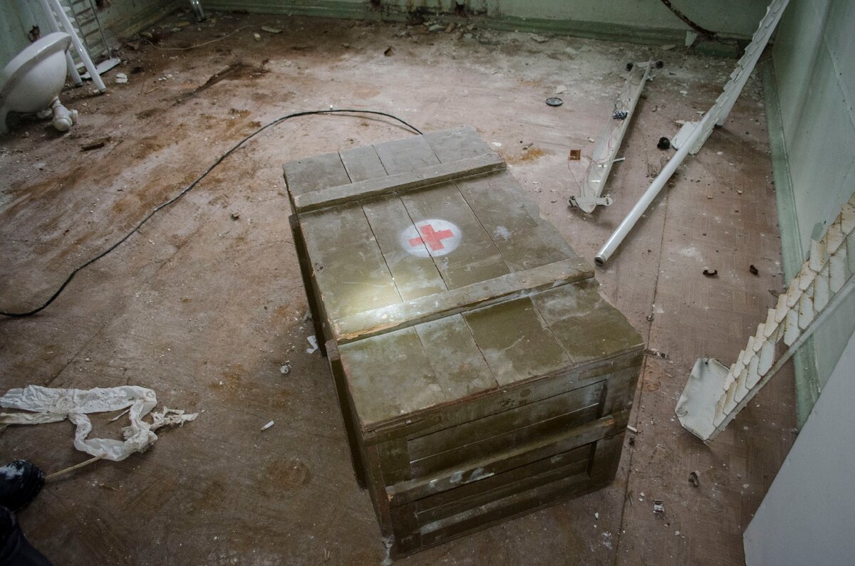 Во многих кабинетах сохранилась мебель,записки врачей,висят халаты