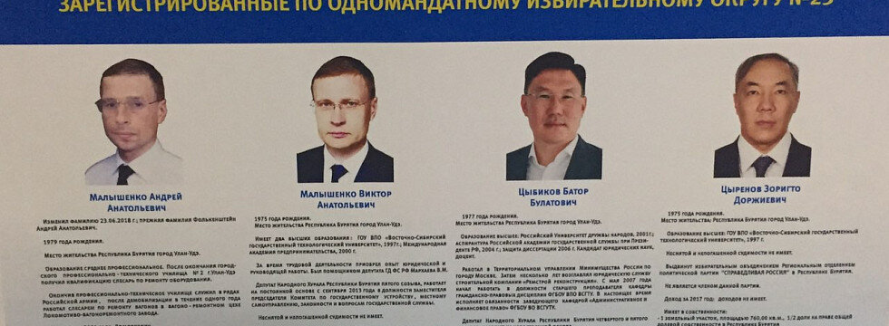 В 2018 году на выборах в Народный Хурал Республики Бурятия выдвинулся кандидат-коммунист Виктор Малышенко. Снять его с выборов никак не получилось, он находился в первой региональной тройке коммунистов, и тогда стали искать двойника-однофамильца. И, что интересно, нашли. Подходящему по внешности человеку, при этом дважды судимому за дезертирство и кражу, пришлось ради выборов в 23-м избирательной округе сменить фамилию на Малышенко. Так в списках появился домохозяин Андрей Анатольевич Малышенко, а с информационных стендов на избирателей смотрели два удивительно похожих человека, сфотографированных в одном ракурсе, с идентичными оправами очков, целых два Малышенко. В Photoshop и не такое можно сделать. Надо ли пояснять, что «домохозяина» Малышенко избиратели нигде, кроме информационных стендов, так и не увидели. Расчёт был ещё и на то, что «фантомный» Малышенко — Андрей — окажется в списке перед реальным Виктором. А потому информационный стенд был сюрреалистичен: два почти одинаковых мужчины с одинаковыми фамилиями, только «домохозяина» Малышенко под номером 1 избиратели и в глаза не видели.