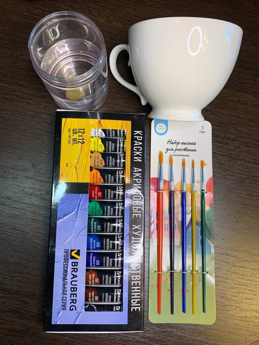 Поверхность кружки желательно обезжирить (уксус или жидкость для ногтей). Перед работой кисточки промываем водой, чтобы они не пушились.