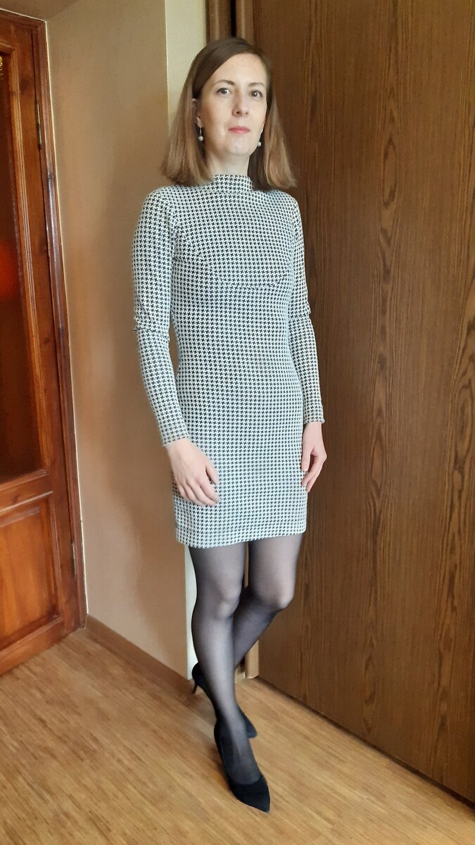 Несмотря на то, что и мини, и платья в обтяжку робко возвращаются в моду, конкретно это все же не очень актуально. Однако, у него модная расцветка - гусиная лапка, и можно его осовременить