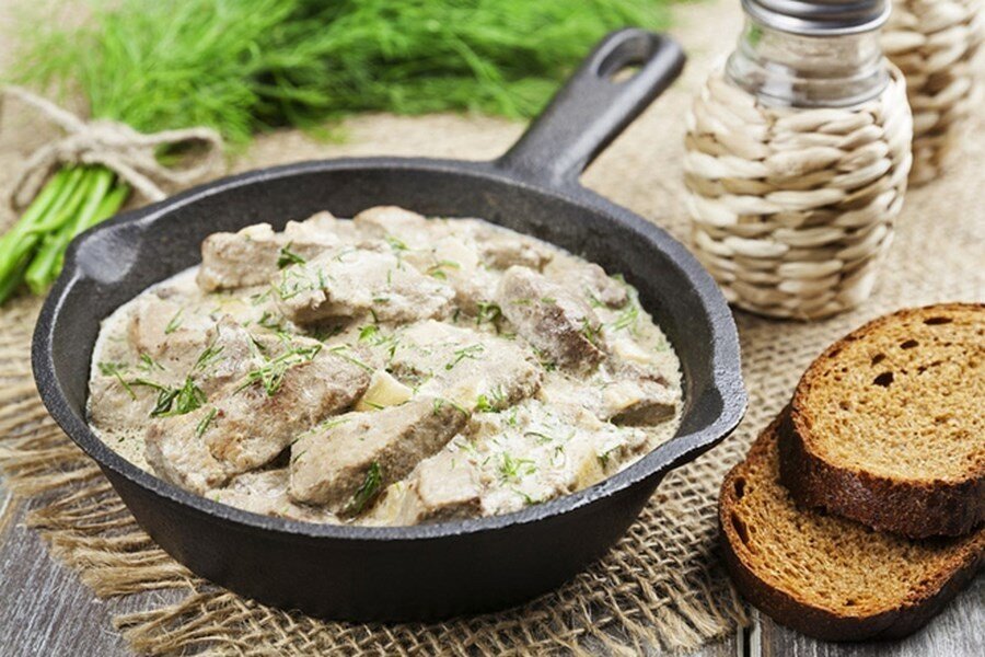 5. В качестве загустителя сметанного соуса я использую муку (некоторые мои друзья используют разведенный крахмал). Муку можно предварительно обжарить на сухой сковороде до золотисто коричневого цвета, она придаст более интересный вкус и цвет соусу. Но я ленюсь, и не всегда это делаю. Итак, добавить 1 – 2 столовые ложки муки (количество зависит от желаемой консистенции соуса и количества добавленной вами воды). Тушить еще 2 — 3 минуты на слабом огне до исчезновения мучных комочков. Посолить по вкусу тушеную печень, перемешать. Снять с огня, дать постоять 10 минут под закрытой крышкой.