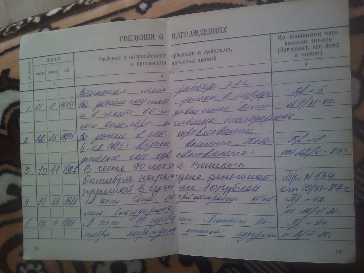 Буквально вчера мы разбирали трудовую моей тети и нашли там записи о том, что ей выдавались грамоты и награды