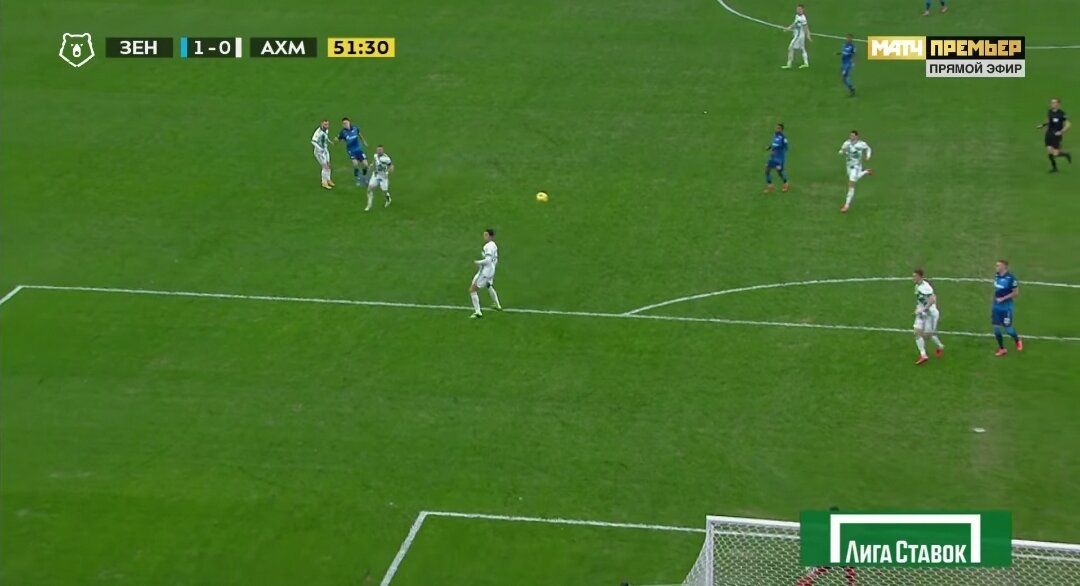 - На 51-й минуте Караваев положил крутую плюху. Защитник "Зенита" прошёл по правому полуфлангу и решился на дальний удар. Шелия далеко вышел из ворот, неожидая такого удара. 1:0