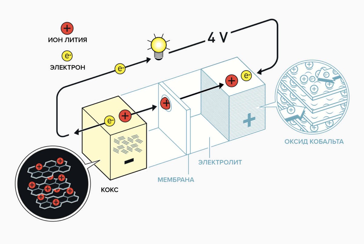 Эти комнаты не пустые. Внутри анода находится графит, а внутри катода - оксид кобальта. Но самое главное вещество внутри аккумулятора - ионы лития. Ион - это атом или молекула, которая имеет электрический заряд. Именно литий отдаёт свои электроны и питает энергией наши девайсы. Поэтому аккумуляторы и называются литий-ионными.
