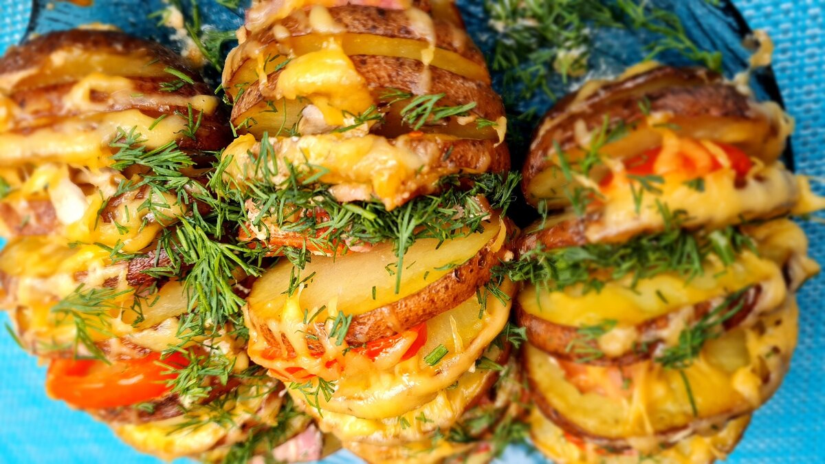 КАРТОШКА - ГАРМОШКА 🥔 в духовке Картофель – 3 шт. Помидоры – 100 г Грибы – 100 г Грудинка - 100 г Сливки – 50 мл Сыр – 100 г Чёрный перец – 0,5 ч.л. Соль – 1 ч.л. Укроп – пучок Чеснок – по желанию Растительное масло – 1 ст.л. 1. Аккуратно ножом делайте на картофеле поперечные разрезы, не дорезая до конца 3-4 мм. 2. Картофель укладываем в форму. Солим и перчим. Добавляем 1 ст.л.