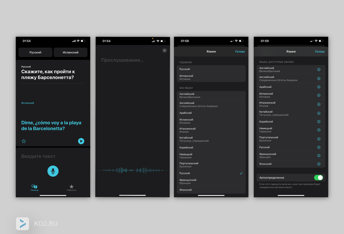До выхода iOS 14 мне приходилось пользоваться сторонними приложениями для перевода от Google и Яндекса, однако теперь в системе есть собственное под названием «Перевод». Помимо текстового ввода фраз оно позволяет задавать их более естественным образом — голосом.