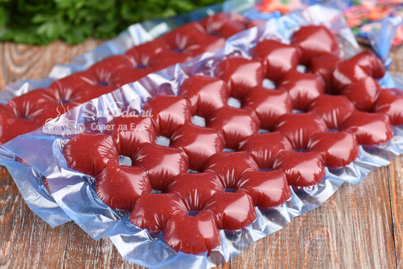 6. Подготовленную смесь из ягод можно перелить в форму, выстеленную пленкой, и охладить. Но мне больше нравится другой способ. Берем 2 пакета для льда, заполняем их смесью из ягод и агар-агара (количество рассчитано на 2 пакета), завязываем пакеты. Отправляем в холодильник на 1 час.