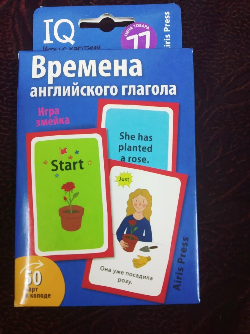 Мы с дочерью приобрели очередные карточки в Фикс-прайсе. Знаете, довольно интересно составлено. Но это уже для продвинутых учеников, знающих глагольную систему.