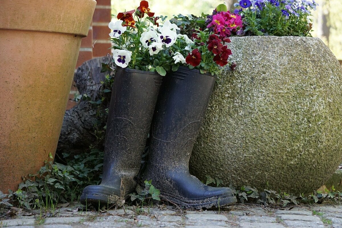 Уверена, что у многих хотя бы одна пара таких сапог есть. Бывает и такое, что купишь новые, пару раз поносишь и резина трескается. На вид такая обувь как новая, но уже не поносишь. Вот тут-то они нам и пригодятся. Сапоги можно покрасить в любимый цвет и посадить туда красивые цветы, допустим петуньи и поставить на клумбу. Будет смотреться очень интересно, да и вещь получит вторую жизнь.