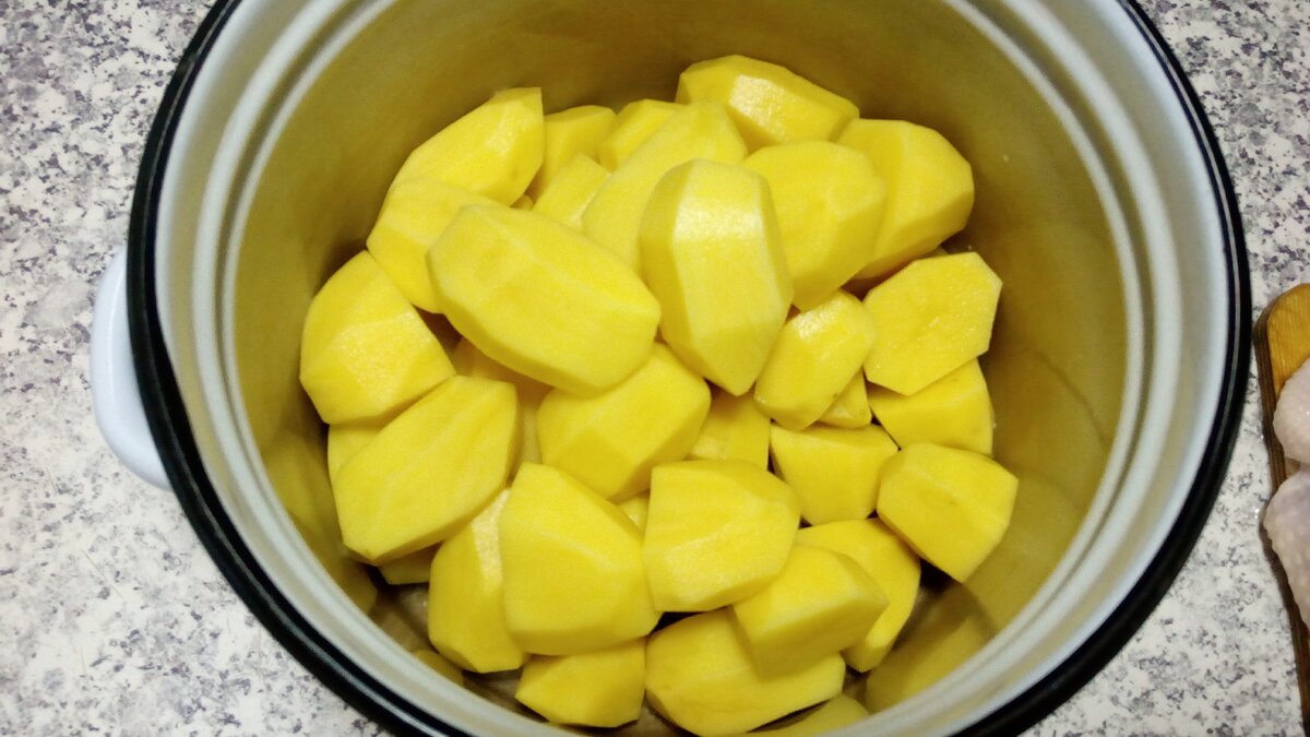 Картошку чистим. Небольшие картофелины оставляем целыми, большую картошку разрезаем. Главное - чтобы кусочки были примерно одинаковыми!