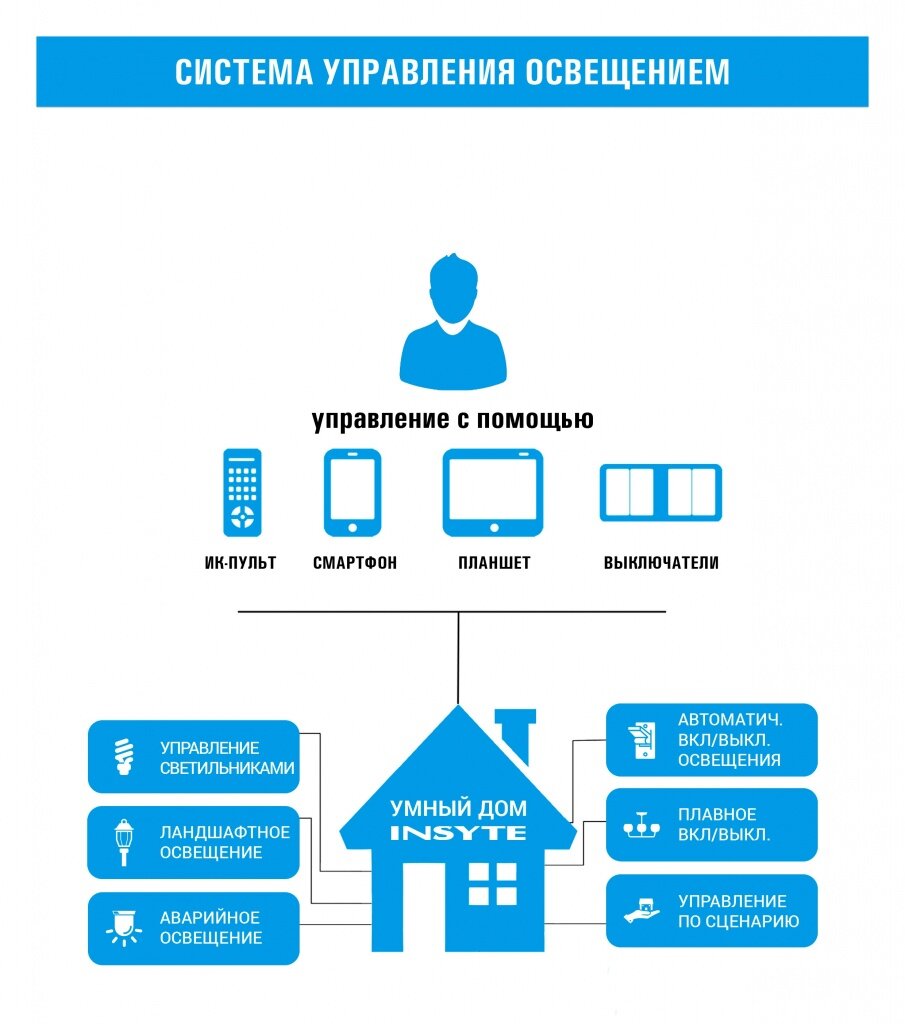 Основные системы и схемы управлением Умным домом управляемое освещение освещение внутри всего дома, освещение снаружи, изменяющиеся световые схемы позволяющие создать особую атмосферу в помещении, авто-включение света при входе в помещение или комнату, включение ламп накаливания плавное с учетом мощности, по одной команде включение всех устройств.