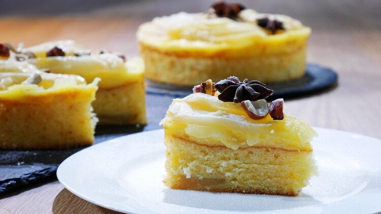 Мы сделаем сегодня зимнюю вариацию пирога с грушами, томленными в сиропе и запеченным заварным кремом.