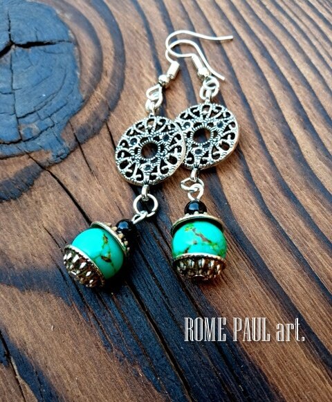 ...Молодая шаманка мельком взглянула на гостя: "Зачем всё это? Вернуть потерянные души за Грань я всё равно не смогу. Сейчас эти эльфы в тишине и покое... Пусть будет так..." В её глазах отразился каминный огонь, блеснул в серьгах, пробежал по бирюзе и зайчиком прыгнул на стену... Материалы: натуральная бирюза (старая иранская), чёрный агат, серебристая фурнитура (США) Длина серьги: 65 мм Диаметр камня: 10 мм Бирюза — это зеленый, белый или голубой минерал с характерными прожилками или небольшими вкраплениями. Одни специалисты относят его к IV порядку первой группы драгоценных камней, другие считают, что бирюза — полудрагоценный камень. Камень был в почете у тибетских шаманов и колдунов. Они использовали его в ритуалах гадания на будущее. Серьги с бирюзой и чёрным агатом поднимут работоспособность, избавив от усталости и головных болей. Многие народы использовали эти волшебные минералы, чтобы привлечь в свою жизнь удачу, защититься от сглаза. НЕТ В НАЛИЧИИ.