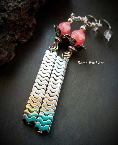 Гематит. Камень для защиты и успокоения. Он помогает организовать мышление, делает его логичнее. На уровне эмоций, он способствует обретению чувства стабильности, снятию тревожности, развеивает негатив... МАТЕРИАЛ: натуральный гематит ("зеркальное железо", Монголия), природный клубничный кварц (ручная огранка, Индия), швензы - ювелирная сталь с серебряным покрытием (гипоаллергенно) Длина серьги: 70 мм ...значение гематита — наделять мудростью и даром провидца. Самоцвет способен раскрыть перед человеком тайны Вселенной. Поможет кровавик гадалкам и прорицателям — будущее предстанет перед ними более четким, ясным и определенным. Таким образом, украшения с гематитом пригодятся перед сеансом ясновидения... ...Клубничный кварц — это розовый сорт кварца , содержащий смесь гетита и оксида железа, которые наполняют кристаллическую матрицу. Этот кристалл резонирует с базовой чакрой. Заземляющие энергии этого кристалла помогут справиться с физическим здоровьем тела. Это уравновесит чувства летуч