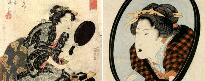 - Японки сбривали брови и подрисовывали черные дуги. Они пудрились белилом, закрашивали родимые пятна на лице и на теле, красили губы красным. Замужние женщины покрывали зубы черным лаком. Типичные японки маленького роста, но на голове имели сооружение из пяти ярусов. Оно поддерживалось палочкой. Чтобы спать с такой прической, под шею клали небольшие подушечки. Их укладывали на специальную подставку. Для блеска волос, японки протирали локоны соком алоэ. Это практикуется и в наше время.