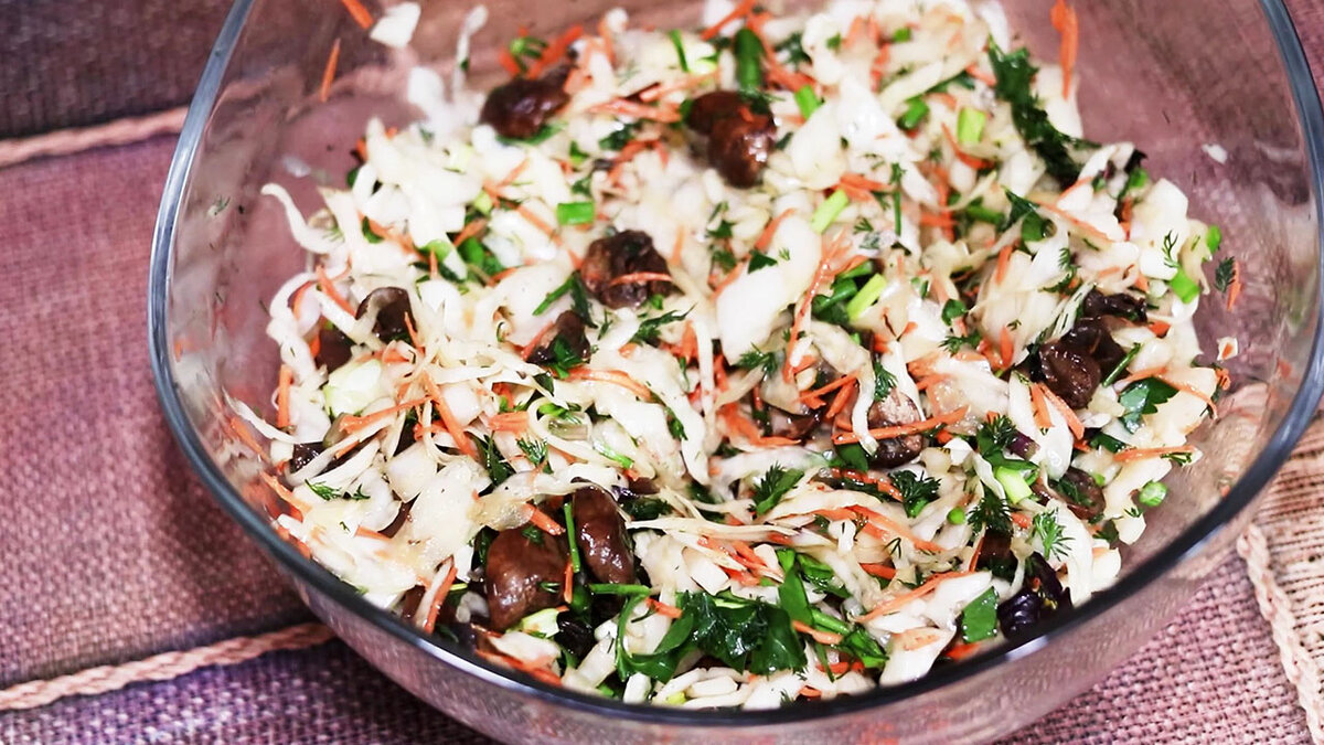 - Смешать квашеную капусту, грибы, морковь, добавить заправку, зелень, соль, перец по вкусу