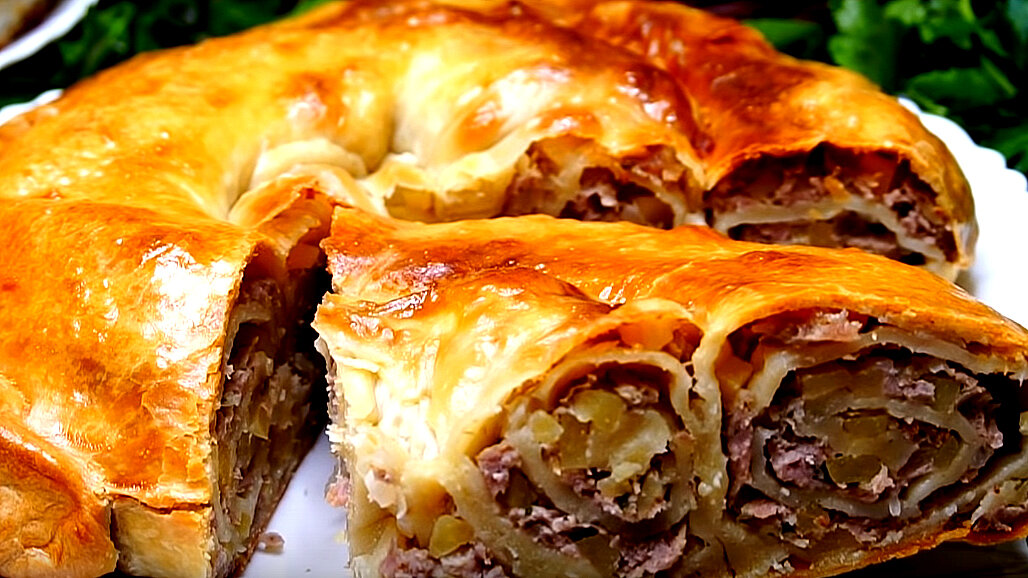 Тесто разделите на три равные части. Растопите сливочное масло. Возьмите одну часть теста и раскатайте толщиной в 1 мм. Смажьте обильно растопленным маслом. Разделите фарш на три части. Возьмите одну часть и распределите на раскатанном тесте. Заверните аккуратно один край внутрь и сформируйте рулет. Края рулета защипните. Повторите весь процесс с оставшимися двумя частями теста и фарша. Включите духовку на 180 градусов. Круглую форму (диаметр примерно 24 см.) смажьте маслом, выложите первый рулет "улиткой". Добавьте по спирали оставшиеся два рулета.