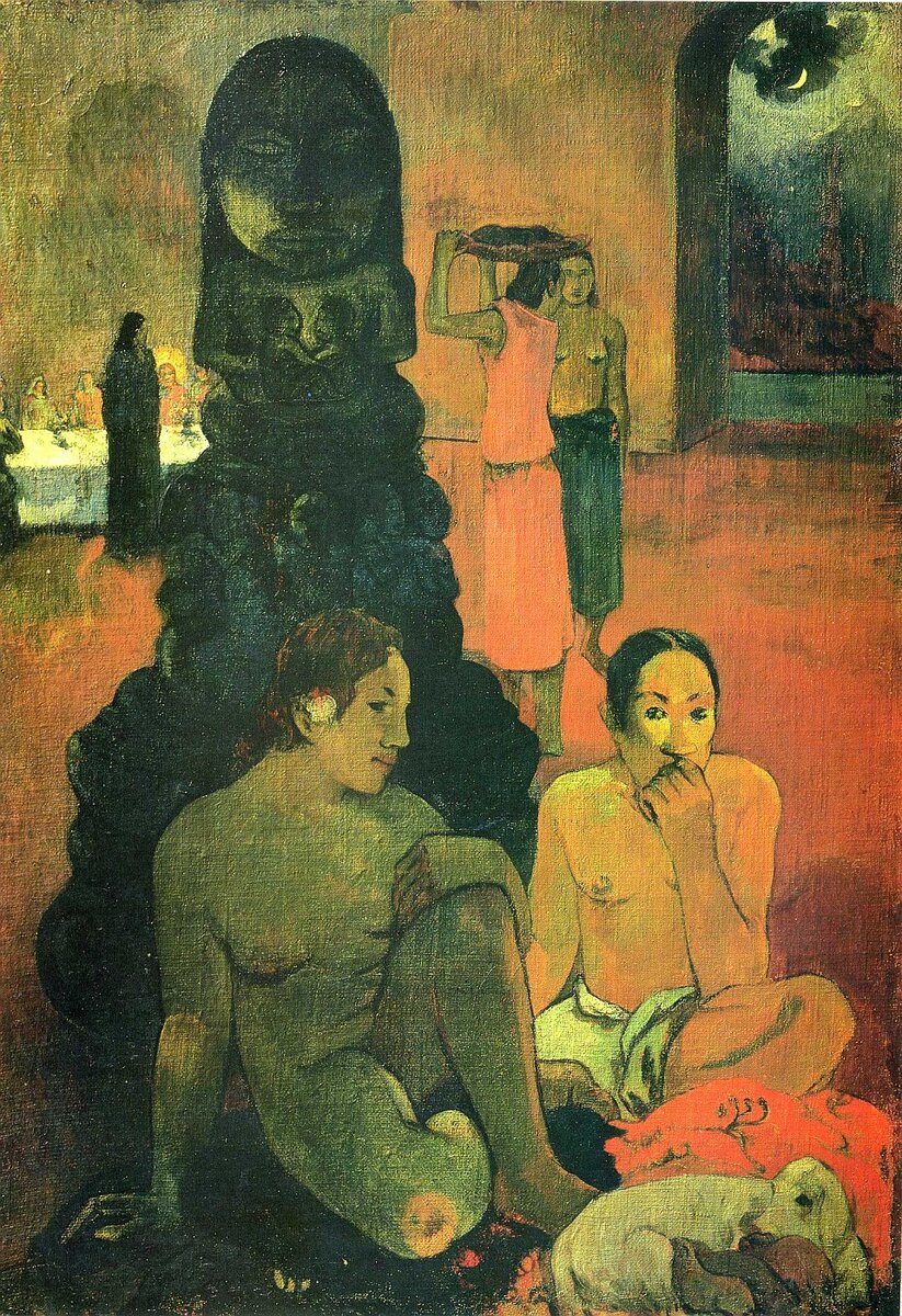 Как я уже сказал, действительность оказалась намного интересней. Здесь Поль Гоген, углубившись в местную эклектику, столкнулся с некромантическими жестокими культами первобытного общества. Он как человек любопытный понял, что имеет дело с чем-то необычным, запредельным. Дело в том, что быт первочеловека очень рационалистичен, это общество всегда находится на грани выживания и их рационализм — суть железная норма бытового экстрима. В таких условиях понятие культуры кажется неестественным, но тем не менее культура здесь существует, если культурой можно назвать ритуал. Причём ритуал, который работает, помогает существовать, приносит добычу, меняет погоду, исцеляет, убивает. Известно, что его таитянская жена Техамана разговаривала с призраками и демонами дрожа от страха, и Гоген понимал, что это не спектакль. Это древня магия, момент грехопадения человека. Здесь бог — это чудовище, здесь мир — это поле битвы, здесь война — это геноцид. Поняв это, можно вернутся к картине.